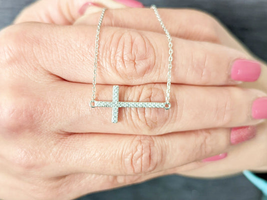 Sterling Silver Sideways Cubic Zirconia Cross Necklace