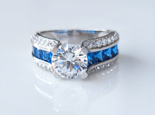 Sterling Silver Round & Princess Cut Clear & Blue Spinel CZ Ring