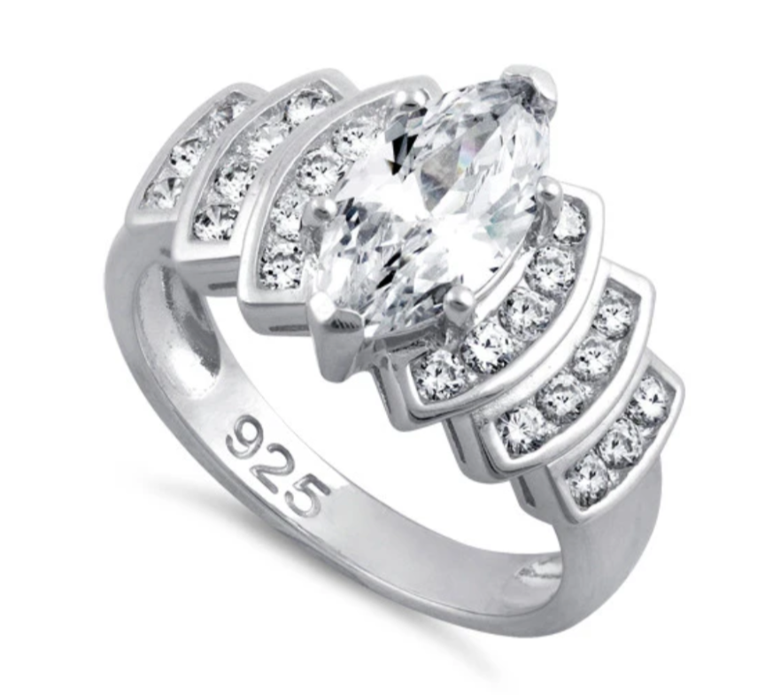 Sterling Silver Marquise Ring, designed for timeless elegance. Featuring a breathtaking 1.62 ct. marquise-cut clear cubic zirconia, this ring captures light beautifully, making every angle sparkle. The 12mm x 6mm center stone is securely set in a prong and bezel setting, surrounded by a halo of 24 additional stones, adding extra brilliance and luxury.